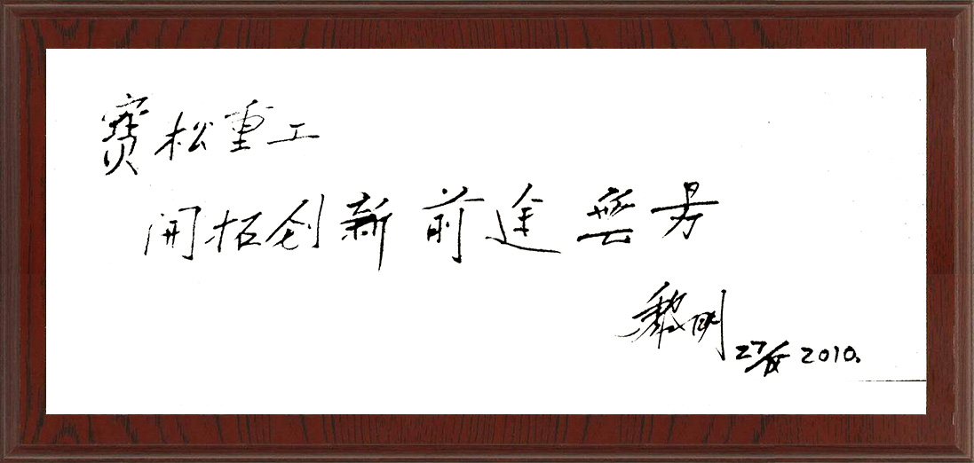 2010年9月,原冶金部第一副部长、宝钢工程指挥部总指挥、宝钢集团董事长黎明部长莅临宝松盐城视察工作,在参观了宝松集团充满朝气的发展新貌后,他挥毫写下“宝松重工開拓创新、前途无量”,并殷切希望宝松努力变胜利在望为胜利在握。