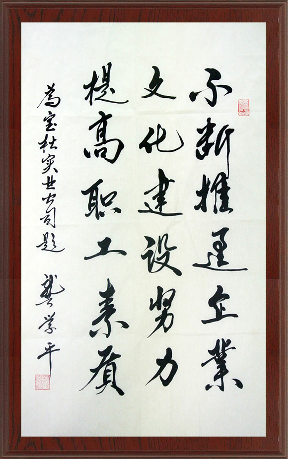 2013年9月,原上海市人民政府副市长、中共上海市委副书记、上海市十二届人大常委会主任、市人大京剧社名誉社长龚学平莅临宝松集团,龚学平在与陶华强董事长亲切交谈后,对宝松的发展和文化十分赞赏,他说,看了宝松的发展,很鼓舞,很感动,宝松取得了很好的成绩,在文化建设方面也很好、很有特色,希望宝松能在上海市的转型发展中贡献力量,在转型发展中取得成功。他还为宝松送上亲手题写的字幅,寄语宝松:不断推进企业、文化建设努力、提高职工素质。